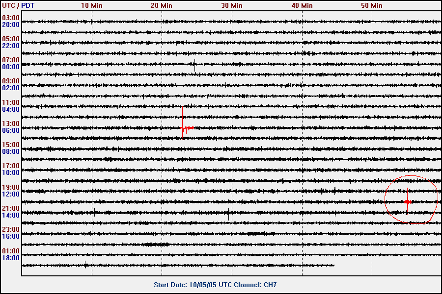 A microearthquake occurred at 1:55:00 PM (PDT) on Wednesday, October 5, 2005.