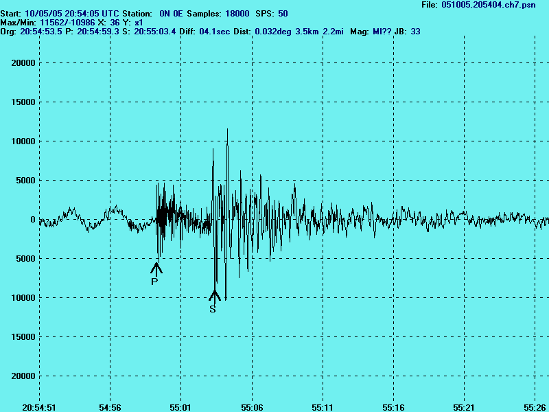 Here are the traces for a small nearby earthquake in San Jose on 10/05/05 at about 20:55 UTC